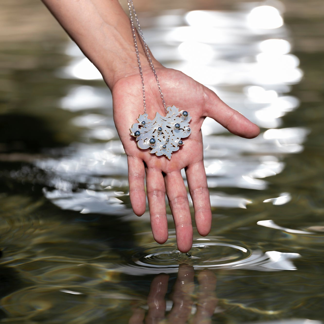 光を受けてシルバーボールが貝に反射し、まるで内側から光り始めるかのような輝きを放ちます。