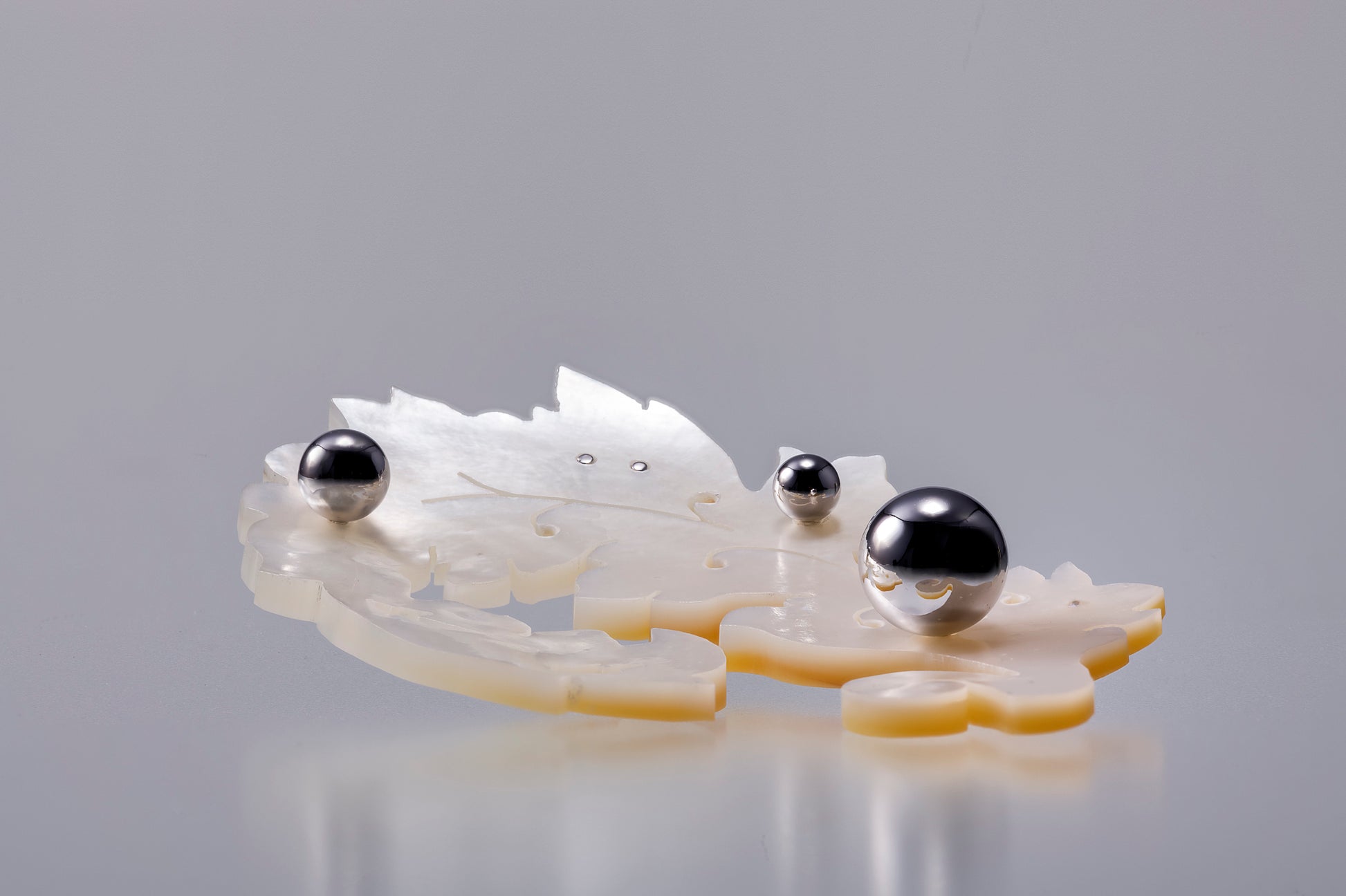 バロック形状の真珠母貝にシルバーボールをあしらい、リズムのある立体感を生み出しました。