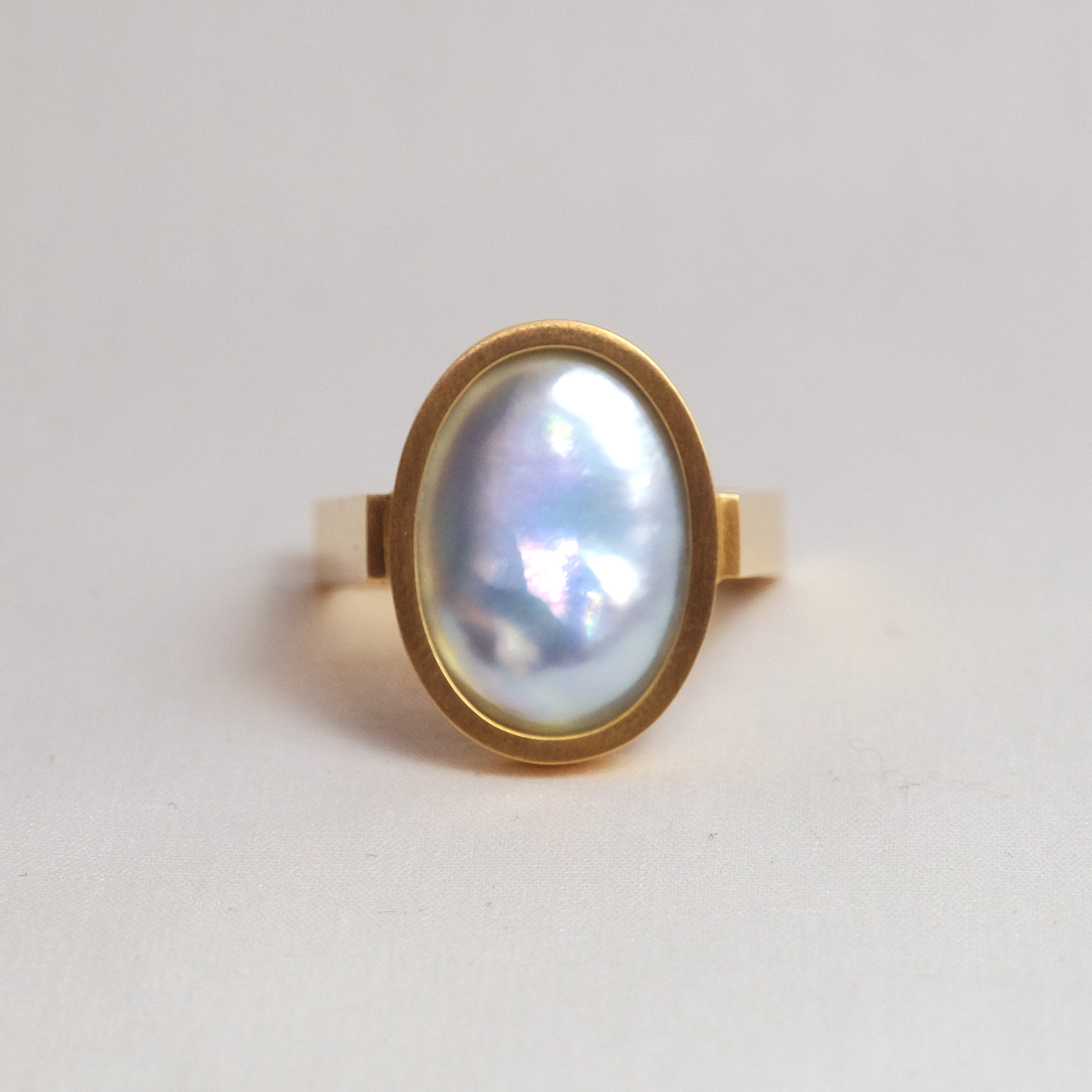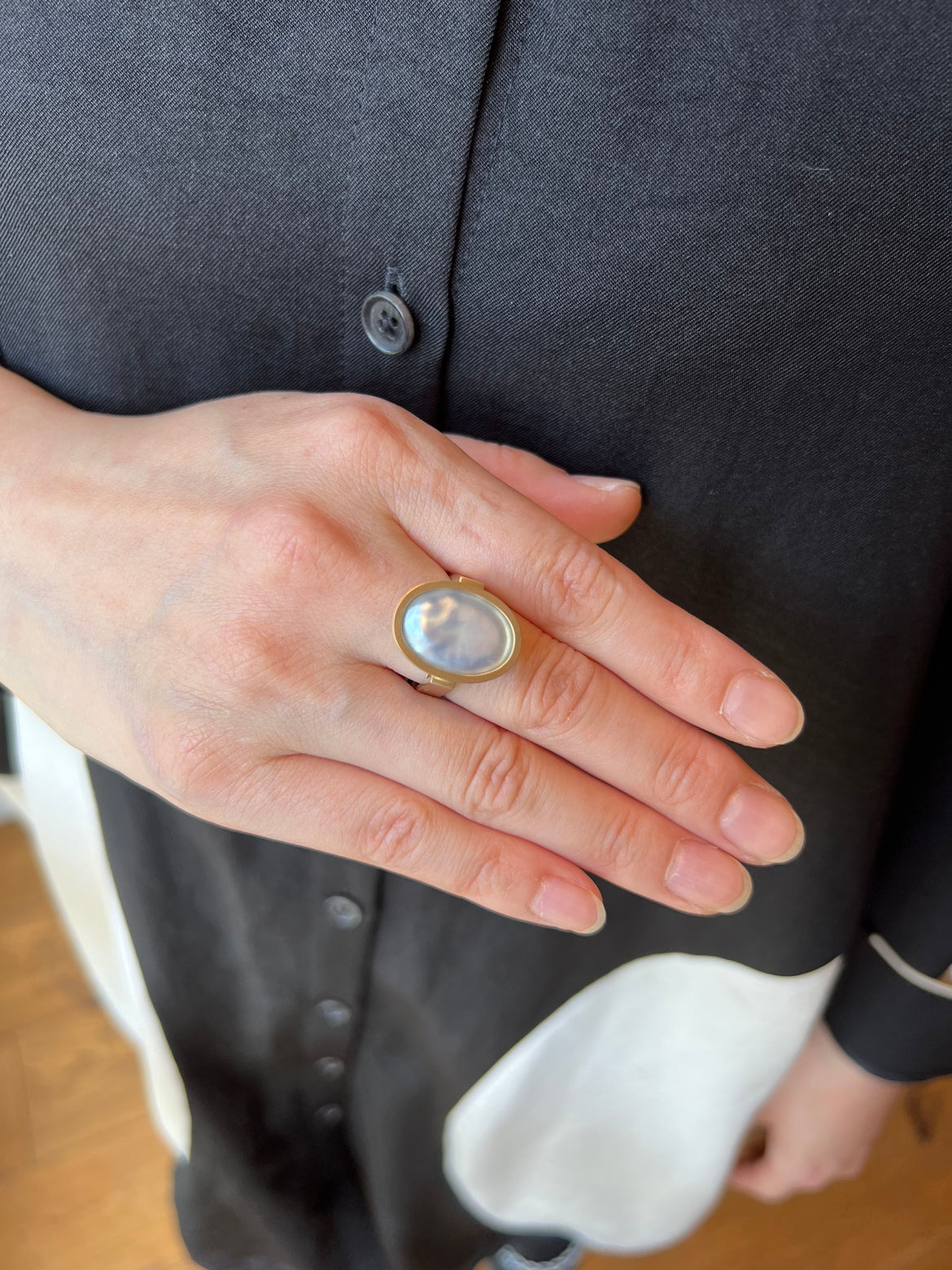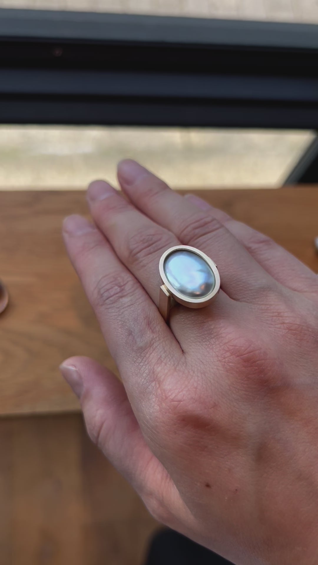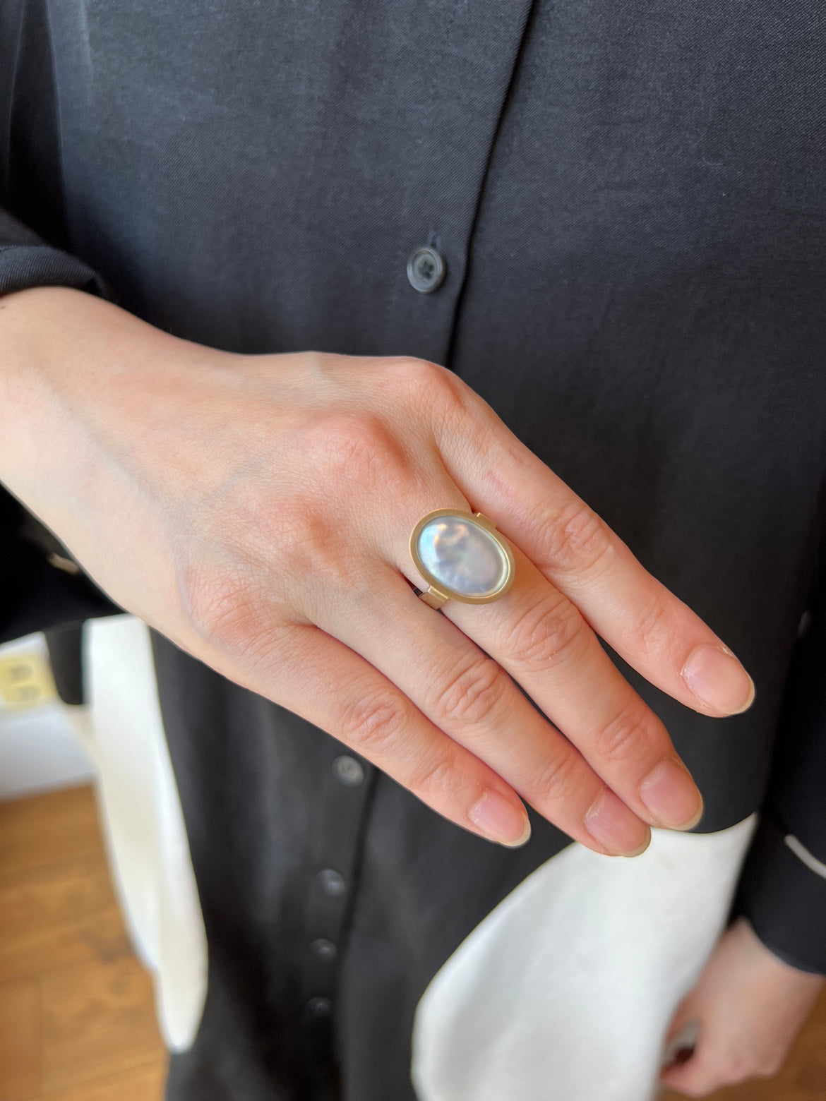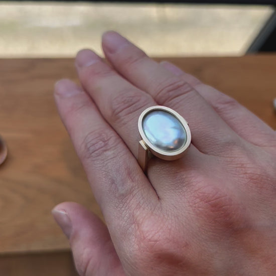 宝石の表面をピッタリと真珠が覆っおり、上から見ると真珠が、横から見ると宝石が見える唯一無二のデザイン、「Cover」。真珠養殖の特許技術を用いた新作です。