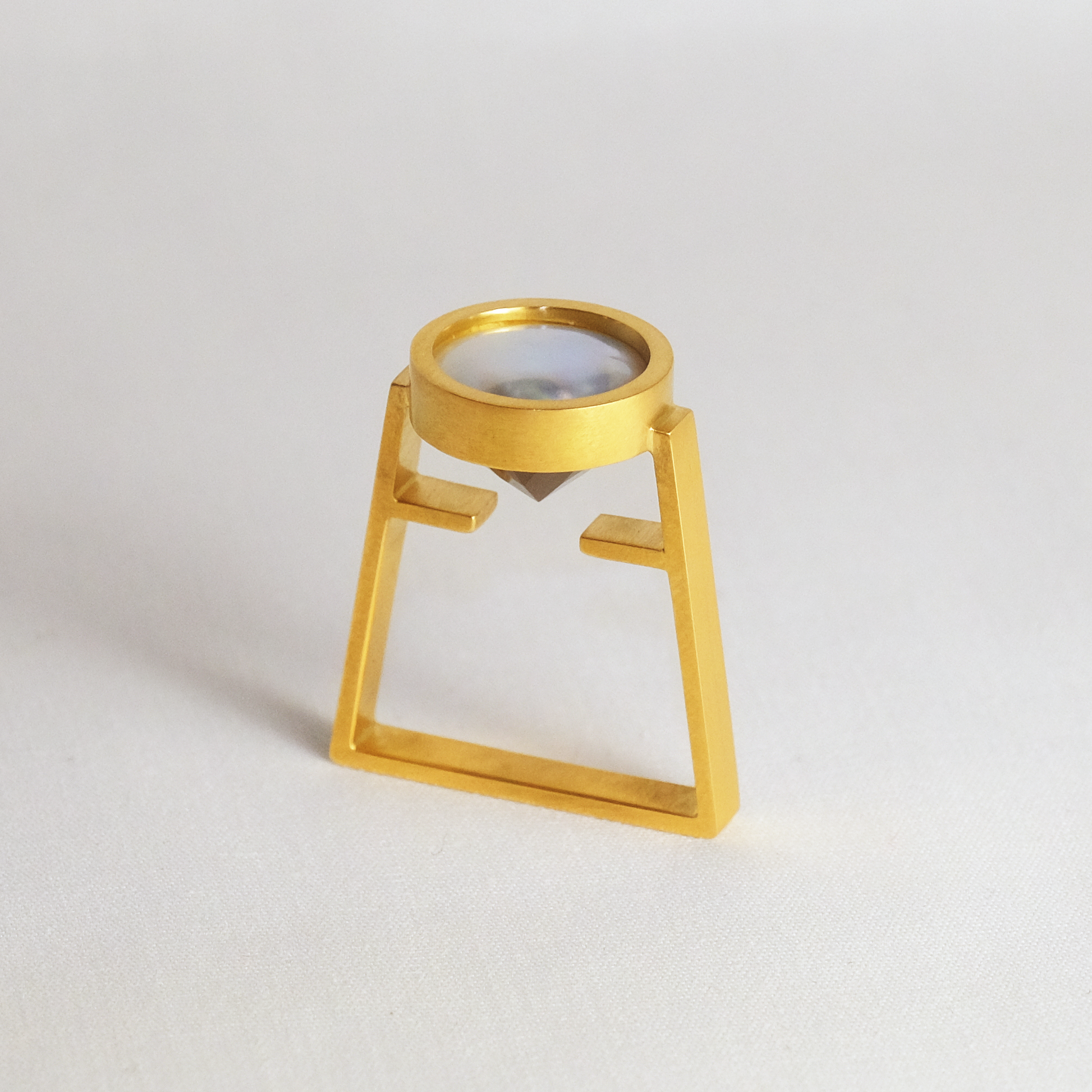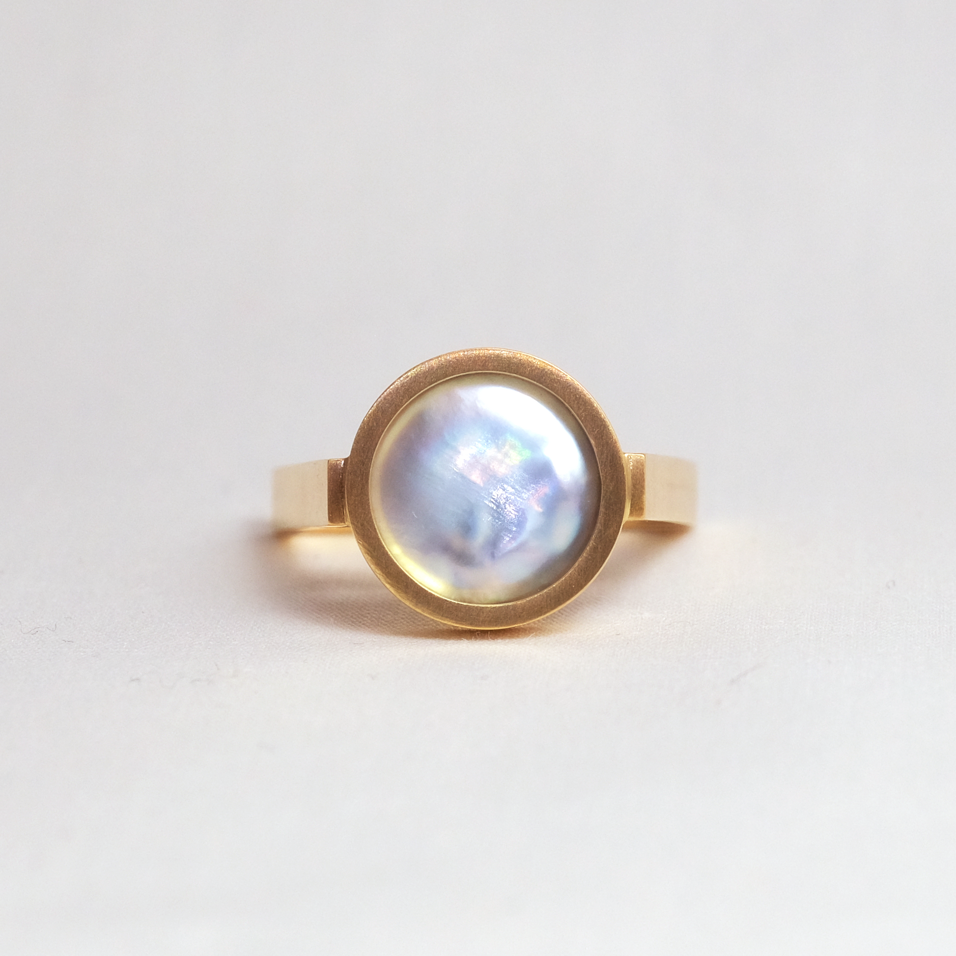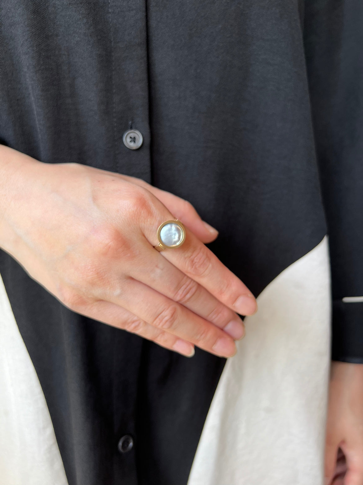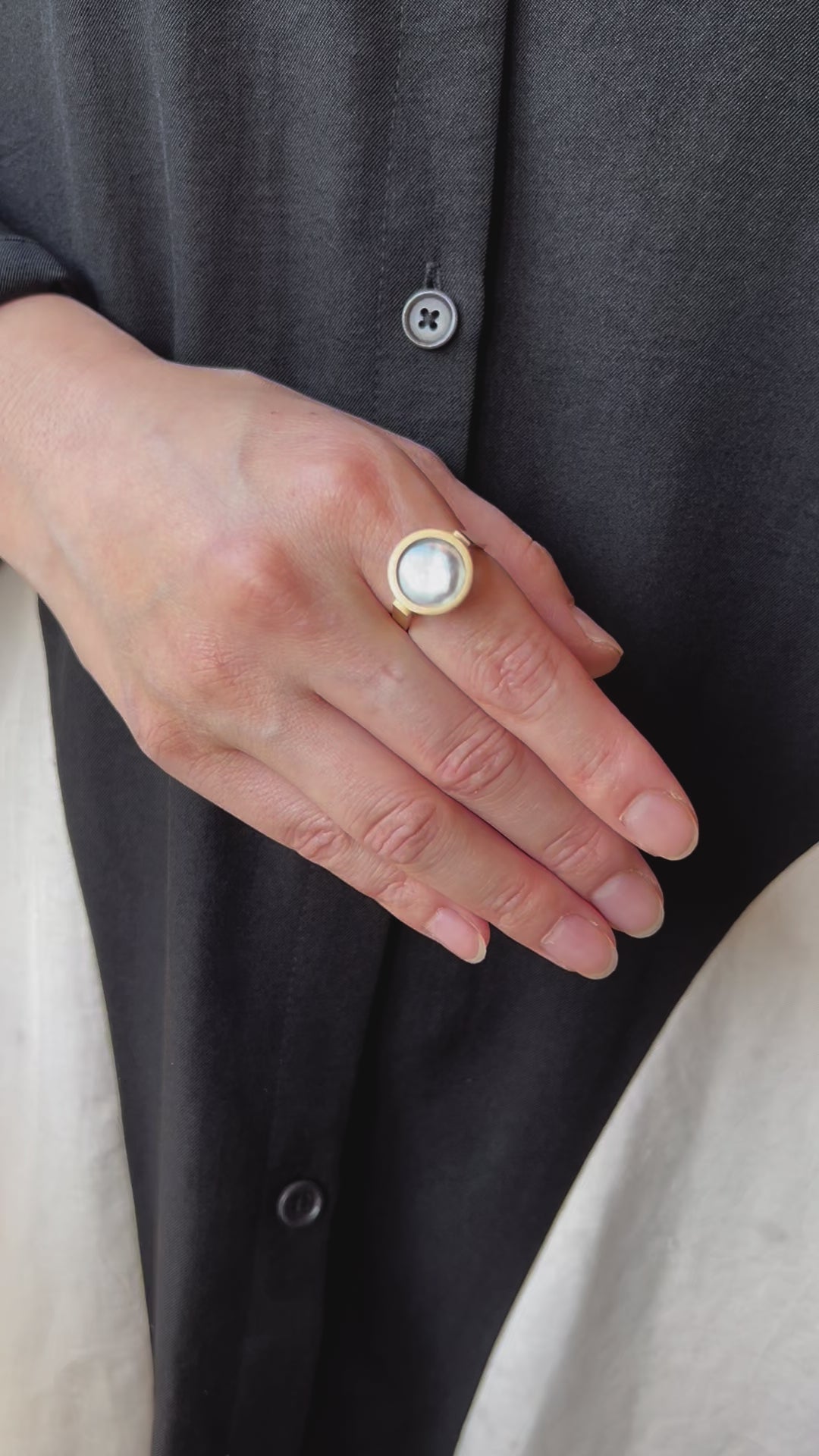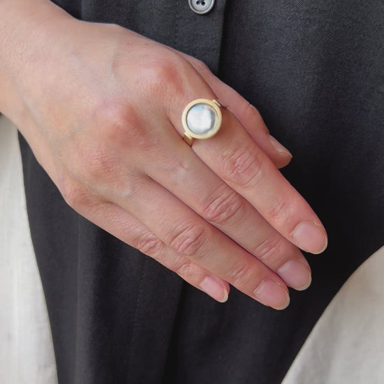 宝石の表面をピッタリと真珠が覆っおり、上から見ると真珠が、横から見ると宝石が見える唯一無二のデザイン、「Cover」。真珠養殖の特許技術を用いた新作です。
