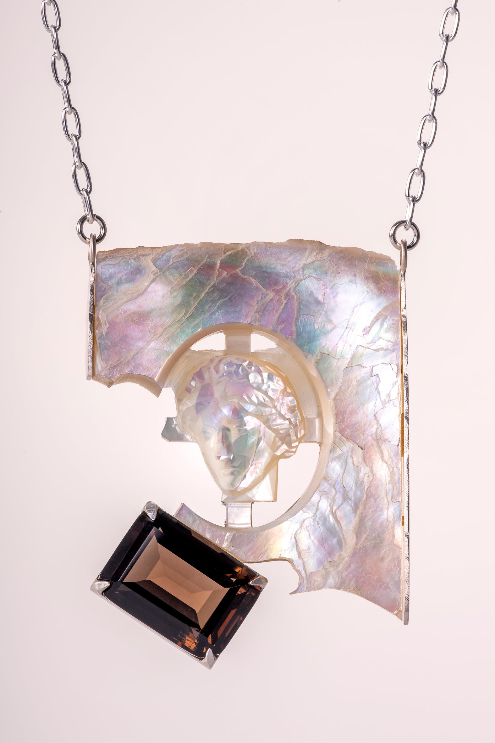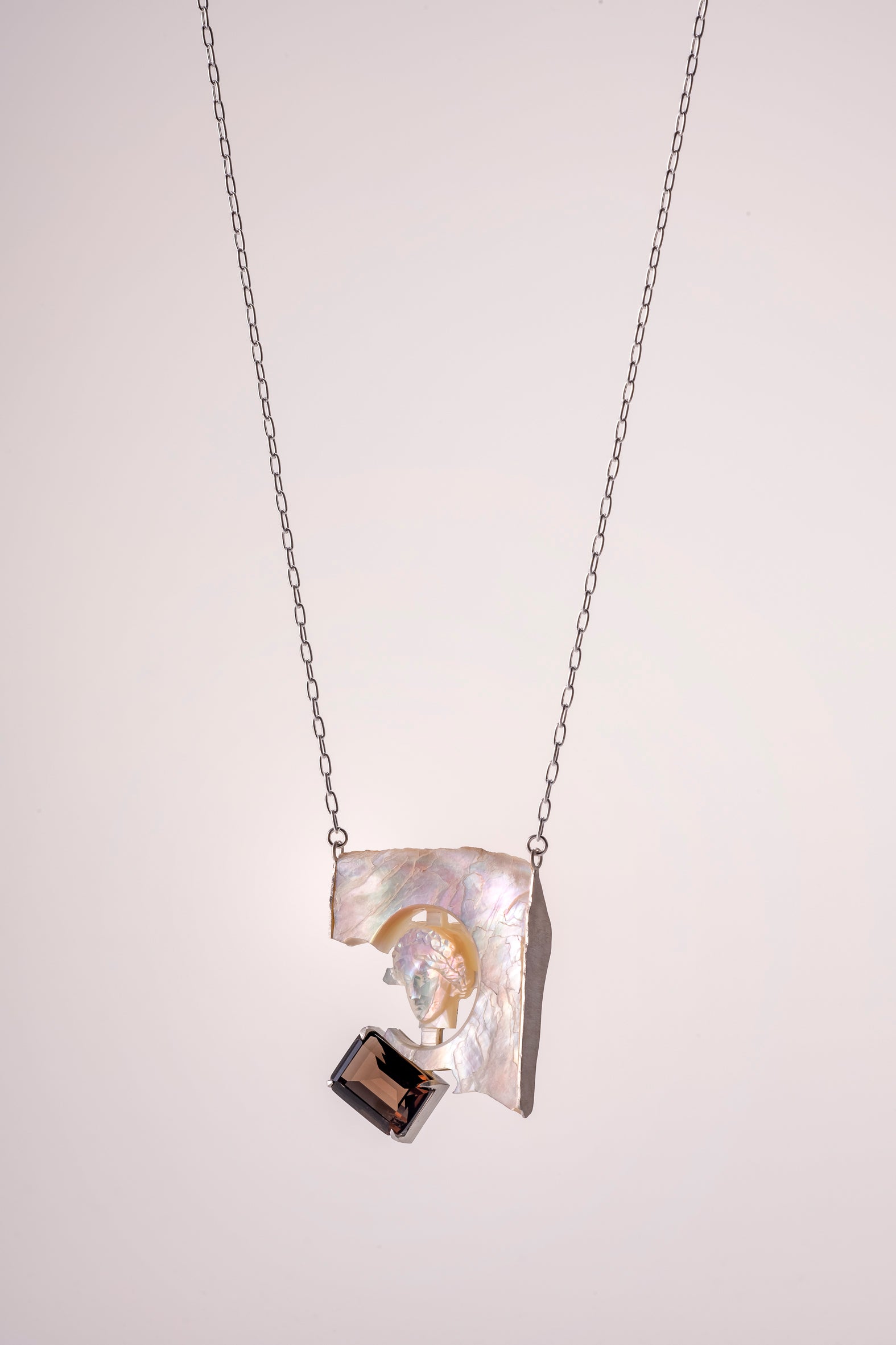 真珠母貝にカメオを彫刻したペンダント。あえて外枠も残したデザインに、左下にはスモーキークォーツをバランスよくあしらい、ラグジュアリーな雰囲気に仕上げました。