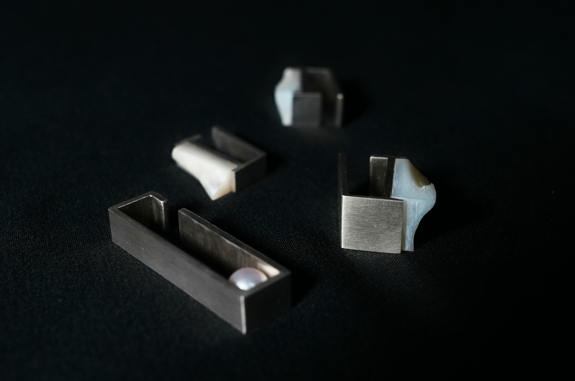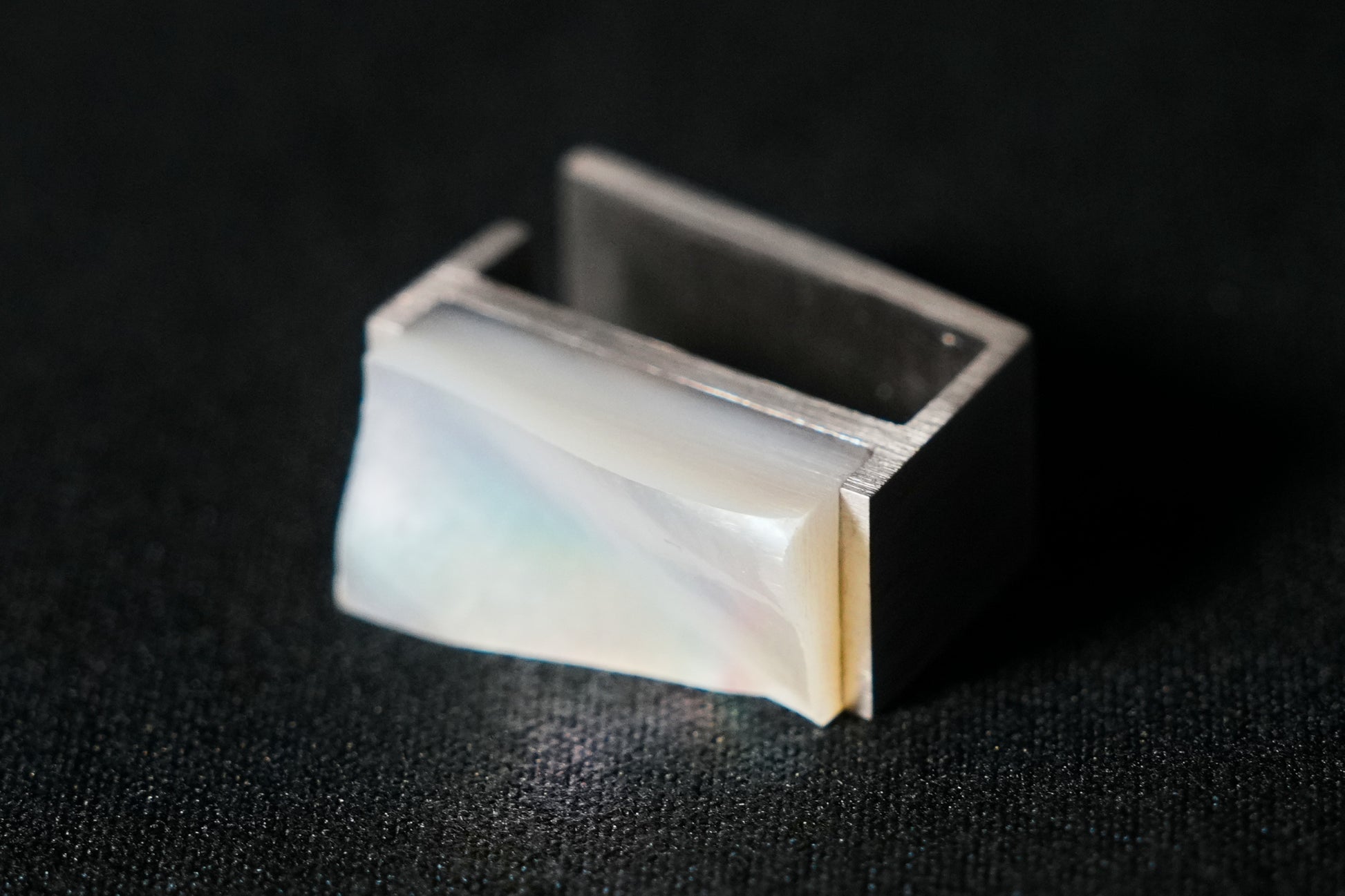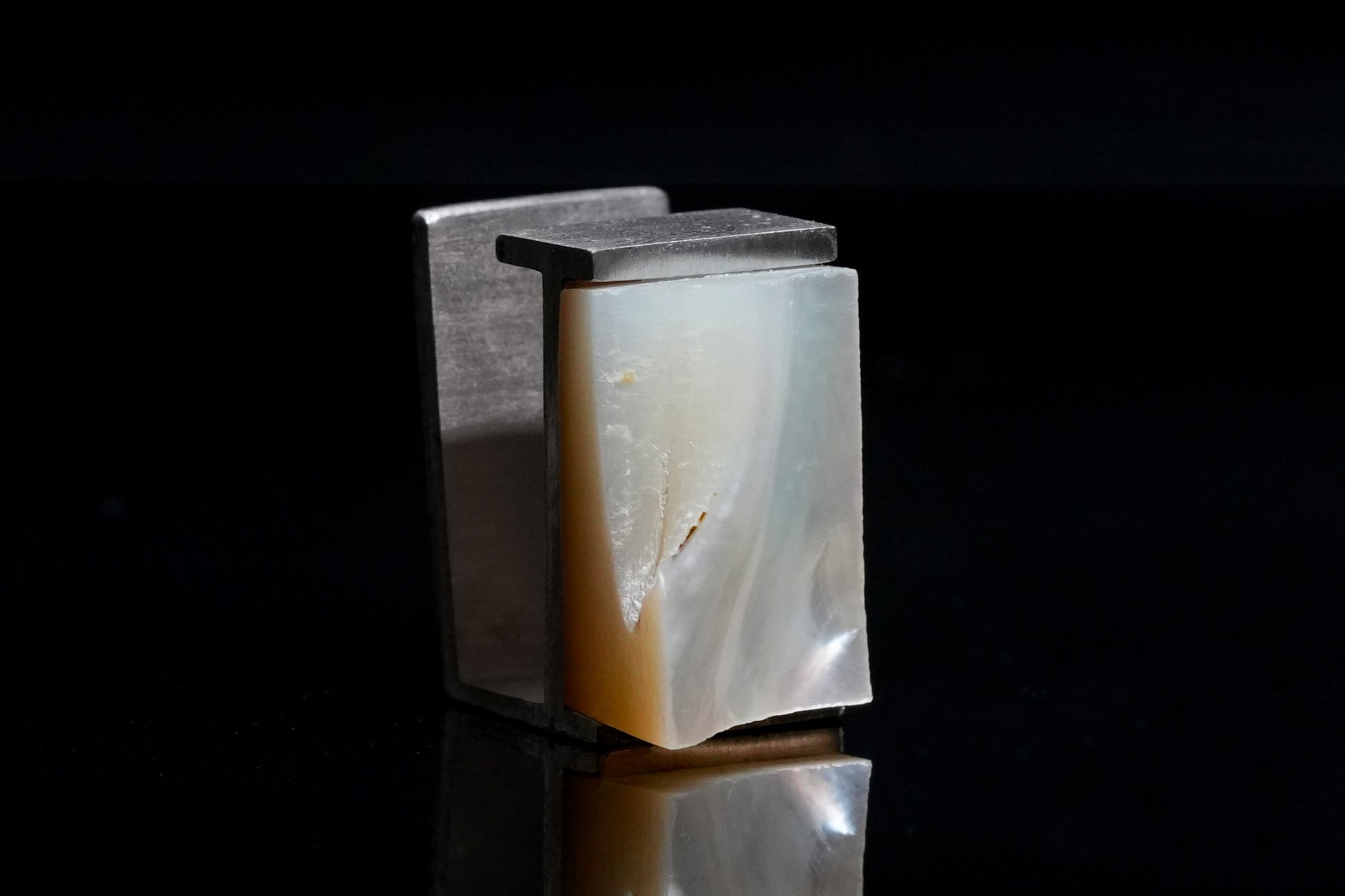 真珠母貝の自然なかたちをそのまま活かしたイヤーカフ。艶やかな表面が光を受けて、角度によって繊細にきらめきます。