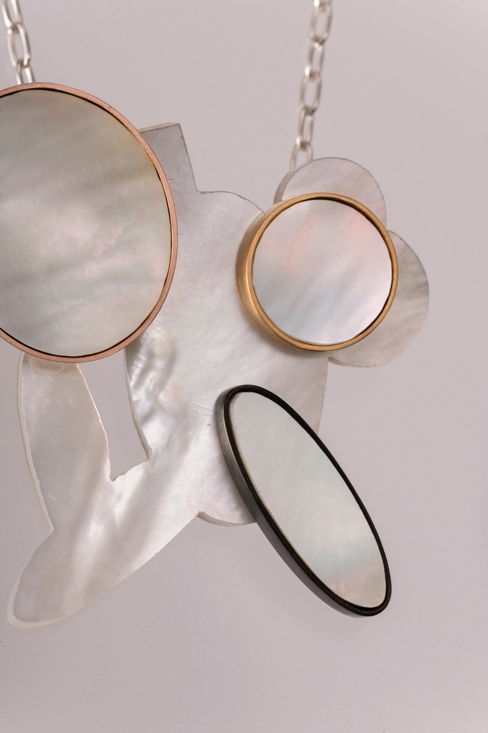西洋絵画のフォルムを幾何学的に切り取ったFormシリーズのネックレス。メッキ加工した金属プレートが鮮やかなアクセントに。