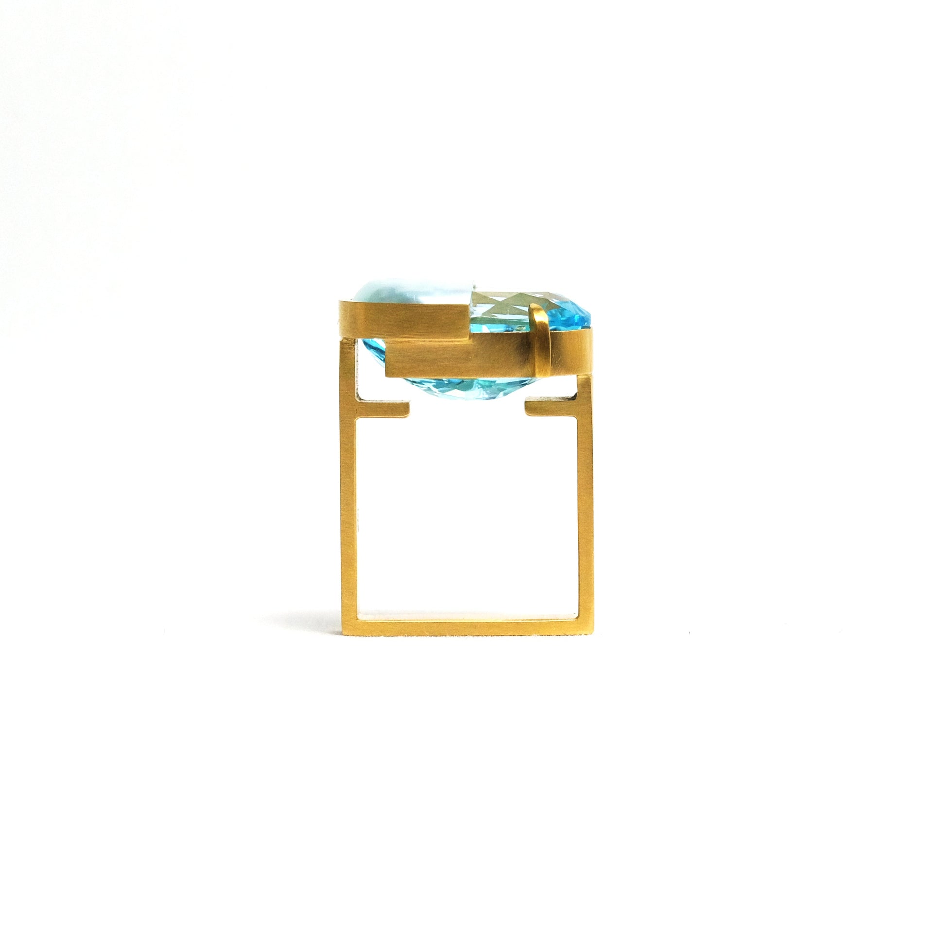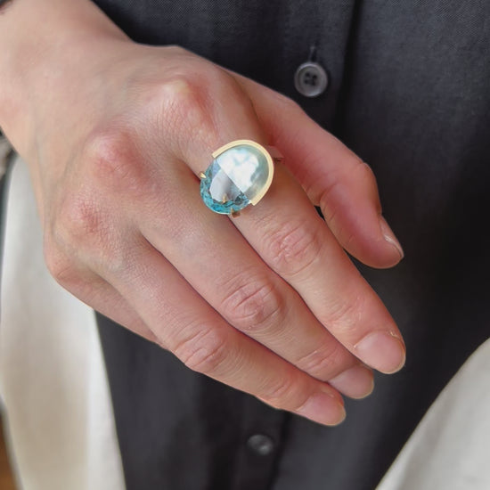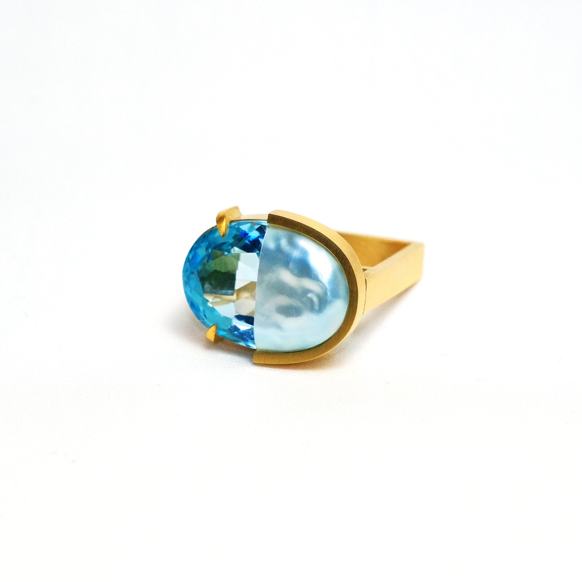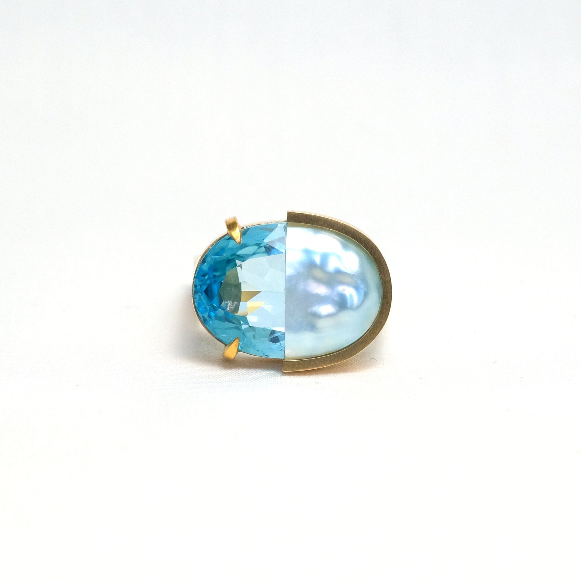 ブルートパーズの上に真珠を被せ、独自の美しさを生み出しました。建築的な視点から構築されたデザインは、ディレクター・小嶋氏によるもの。