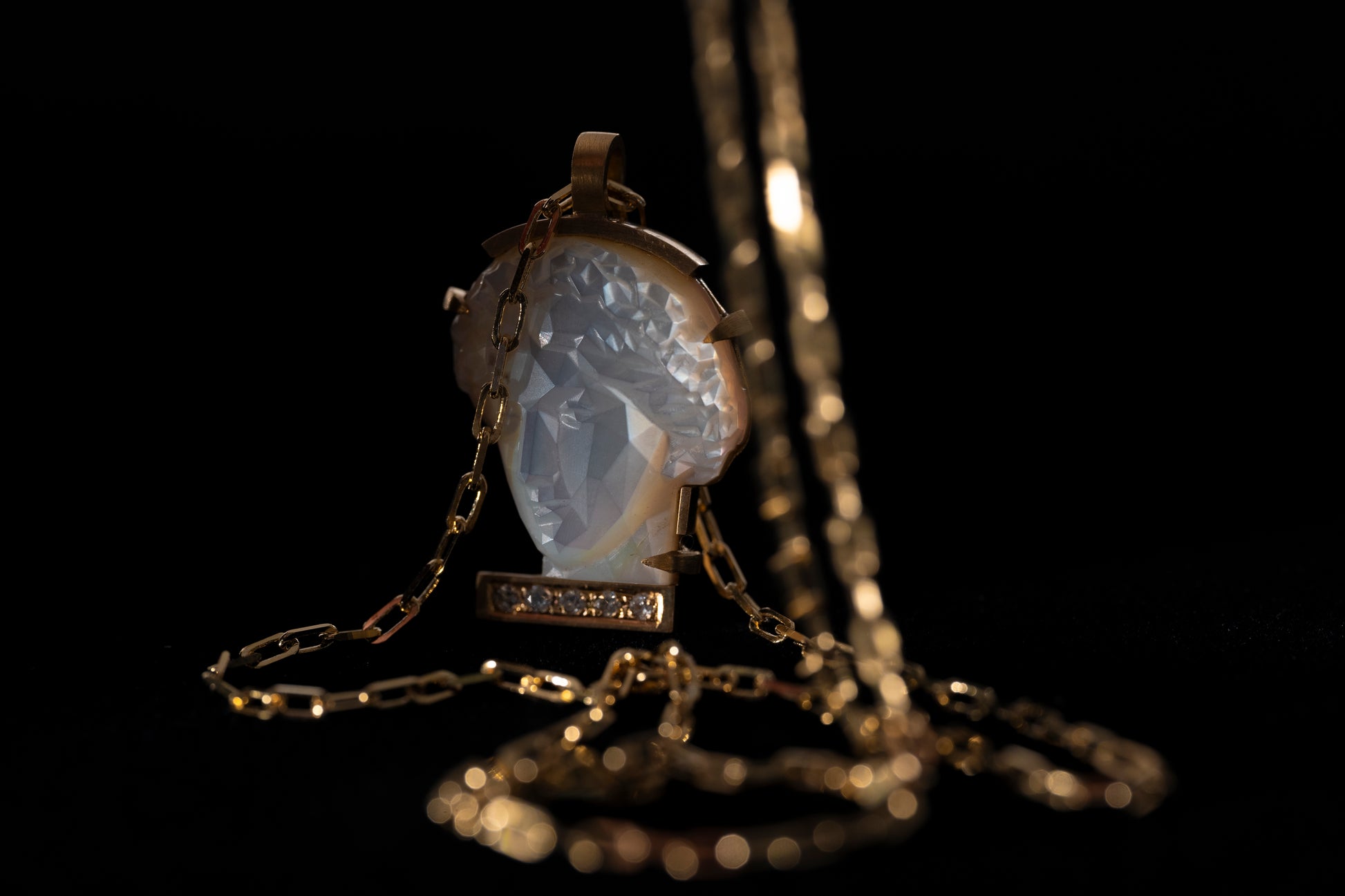 伝統的なカメオの概念を再解釈した「Someone_ Polygon_ Pendant」は、当社独自の精密切削技術により母貝から直線的な表面を創出しています。一つひとつ丁寧に選ばれた貝を、熟練職人の手作業と最先端デジタル技術の融合によって加工。従来のカメオの枠を超えた幾何学的な表現が、現代的なエレガンスを纏ったペンダントとして生まれ変わりました。ブランドの美学を象徴する逸品です。